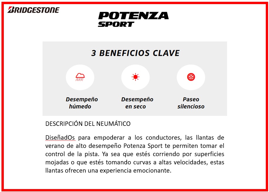 Potenza Sport controla tu viaje, despierta tus sentidos. El Bridgestone Potenza Sport es un neumático de altas prestaciones que te permite aprovechar todo el potencial de tu vehículo y mantener un control total durante tu viaje.